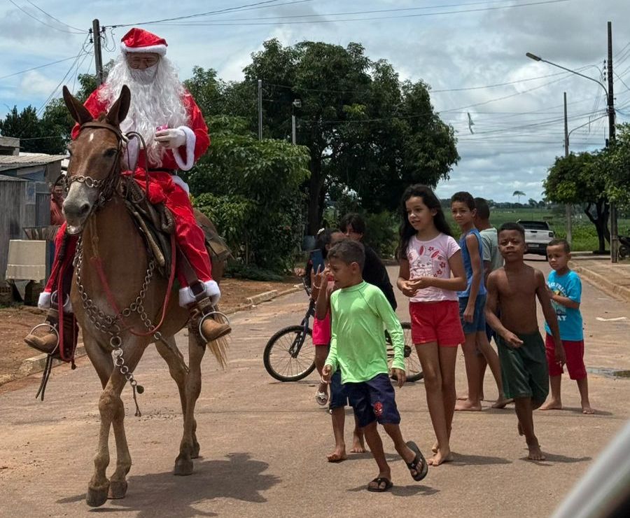O clima natalino ganhou um toque especial e cheio de identidade regional em Vera-MT. Vestido de Papai Noel, mas com chapéu de cowboy, 🎅🤠 botas
