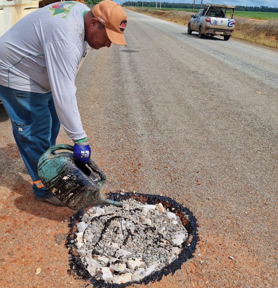 A Secretaria de Obras de Vera está executando um amplo serviço de tapa-buracos na MT-140, no trecho que liga o município a Santa Carmem. As