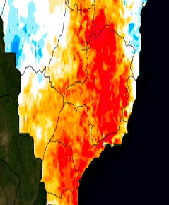 No mapa acima, as partes em laranja e vermelho indicam calor excessivo — quando mais escuro, mais quente. E em azul, as áreas em que houve temperaturas mais baixas que o esperado.