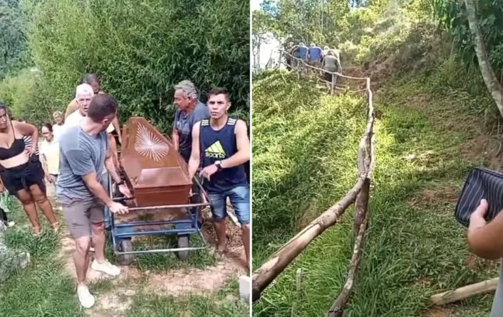 Um vídeo, gravado nesta sexta-feira (02), mostra filhos e parentes carregando o corpo morro acima.