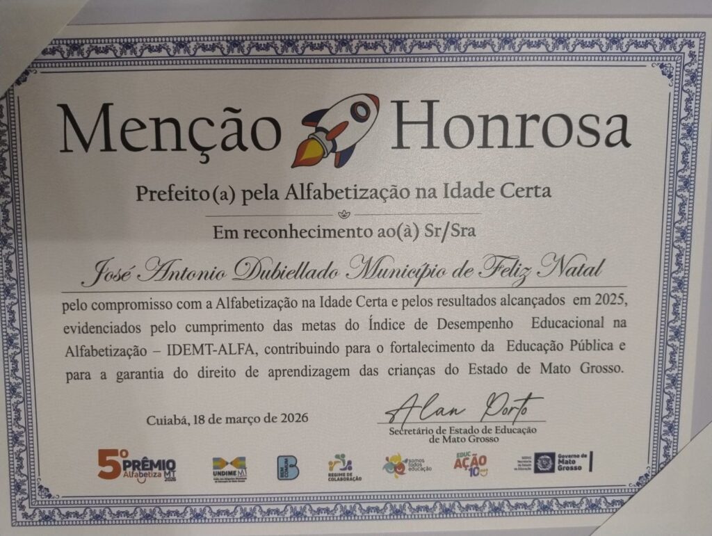 O município de Feliz Natal, no norte de Mato Grosso, alcançou um importante reconhecimento estadual ao se consolidar entre as melhores cidades na área educacional. Na 5ª edição do Prêmio Alfabetiza MT 2026, a cidade garantiu a 12ª colocação no ranking do IDEMT-Alfa, indicador que mede o nível de alfabetização dos estudantes da rede pública municipal.