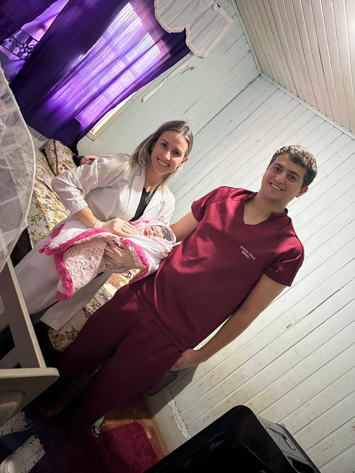 Em resposta, uma equipe composta pela enfermeira Jéssica Tonin e pelo médico Dr. Vinícius Zanoli foi enviada rapidamente ao local. Ao chegarem à residência, os profissionais se depararam com um cenário delicado: o bebê já havia nascido antes da chegada da ambulância.