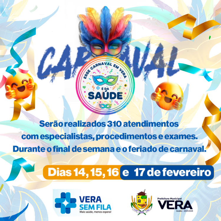 A Prefeitura de Vera vai transformar o período de Carnaval em uma grande mobilização pela saúde pública. Em vez de investir recursos na realização de festividades, o município optou por direcionar os valores para a saúde e promover um mutirão de consultas, exames e atendimentos especializados.