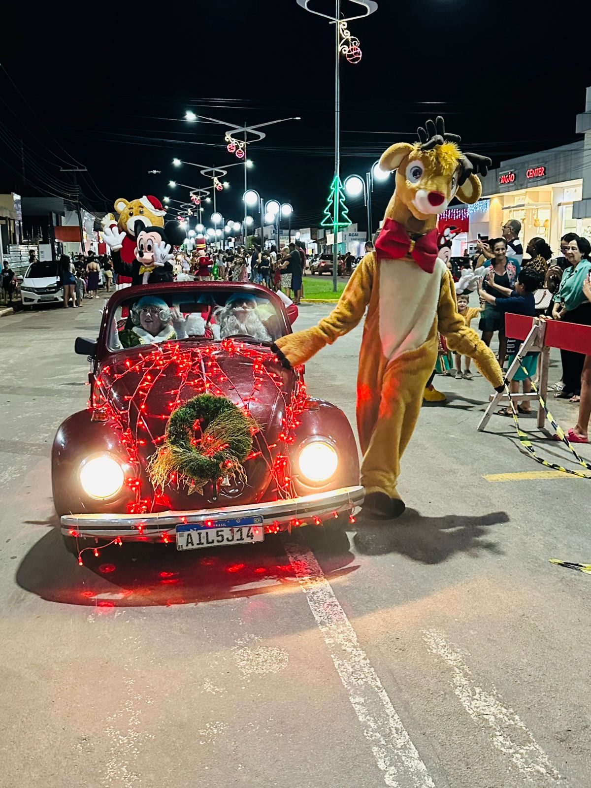 Ao longo do trajeto, o público acompanhou a apresentação de diversos personagens natalinos que deram vida ao espetáculo, como as Cristais de Gelo, o Perna de Pau, Bonecos de Neve, Renas, Soldadinhos, Biscoitos e personagens temáticos, além das tradicionais figuras natalinas. O ponto alto da noite foi a chegada do Papai e da Mamãe Noel, que desfilaram em um fusca decorado, arrancando aplausos e sorrisos do público presente.