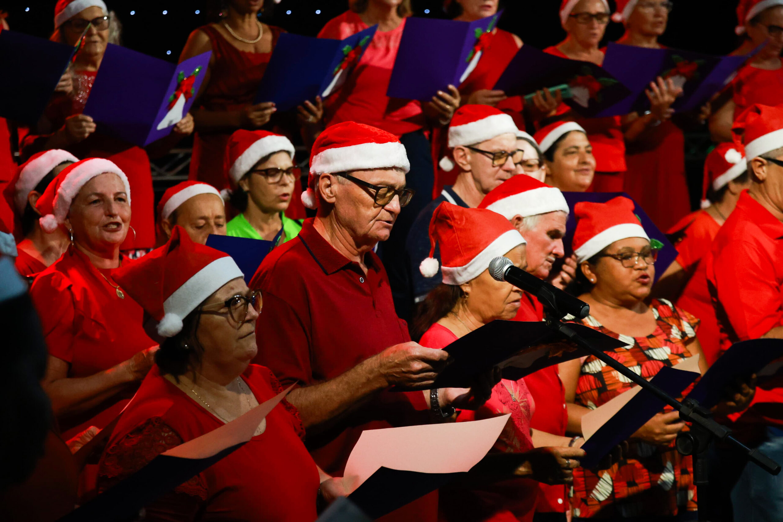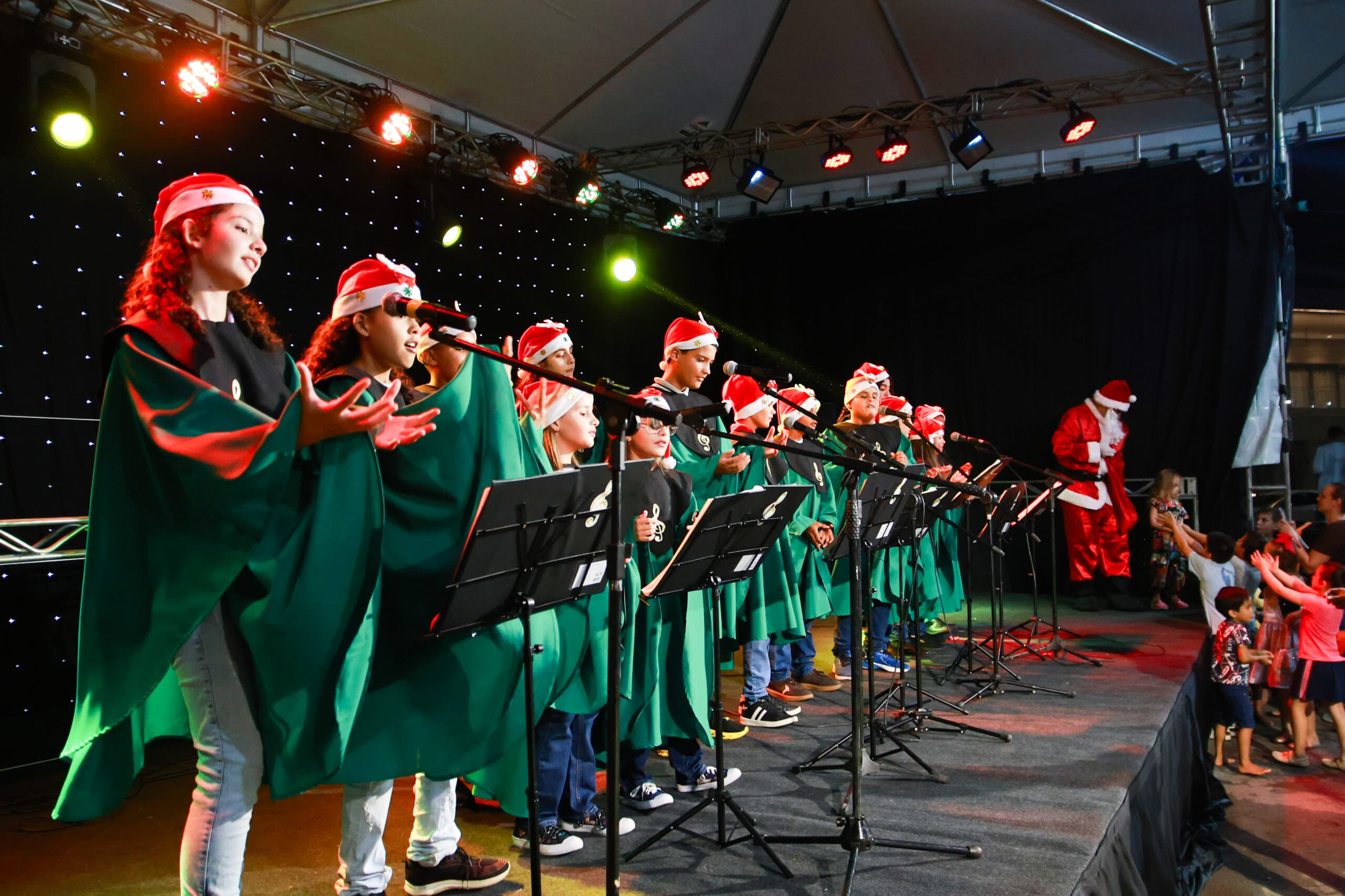 Já na praça, o público acompanhou uma sequência de apresentações culturais que deram o tom da noite. O grupo da Terceira Idade, a Escola de Balé do Centro Cultural, o Coral Vozes que Encantam e a Banda Municipal emocionaram o público. Nem mesmo a chuva leve, que caiu de forma tímida, foi capaz de interromper o espetáculo ou diminuir o entusiasmo dos presentes.