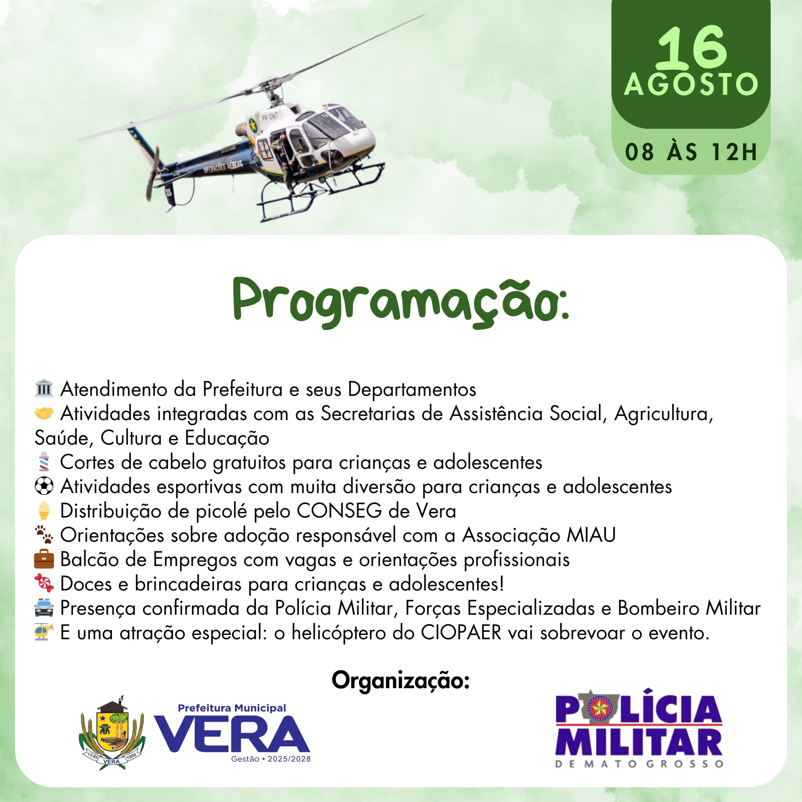 A programação inclui atendimento da Prefeitura e de seus departamentos, atividades integradas com as Secretarias de Assistência Social, Agricultura, Saúde, Cultura e Educação, além de cortes de cabelo gratuitos para crianças e adolescentes, práticas esportivas e distribuição de picolés pelo CONSEG de Vera. Haverá ainda orientações sobre adoção responsável com a Associação MIAU, balcão de empregos com vagas e informações profissionais, doces, brincadeiras e outras atrações para o público infantil.