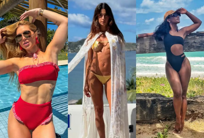 Karoline apostou em um biquíni azul diferentão, no formato cortininha, mas com babados que se estendem até a barriga, fugindo do óbvio. Já Isis escolheu um pretinho nada básico, também no modelo cortininha, com bordas nas cores azul, verde e amarelo, em referência à bandeira do Brasil. Thaila, por sua vez, ousou ao investir em um biquíni dourado, com detalhe em formato de estrela no busto, chamando atenção pelo brilho e originalidade.