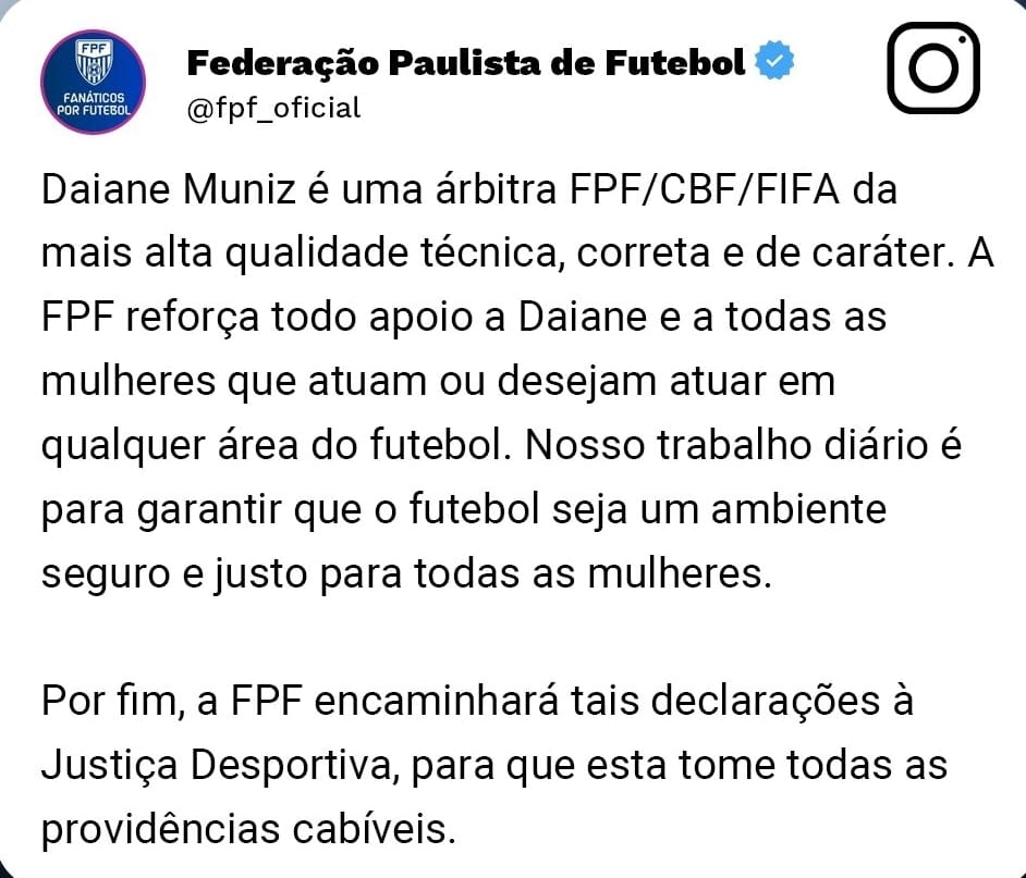 O clube postou uma nota oficial nas redes sociais em que reforça o pedido de desculpas às mulheres e, principalmente, à árbitra Daiane Muniz. O comunicado diz ainda que o clube não compactua e repudia a fala machista do zagueiro Gustavo Marques, dita após a partida.