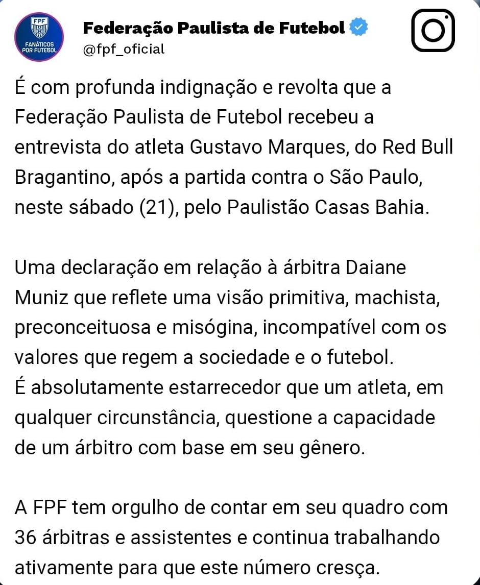 “O Red Bull Bragantino vem a público reforçar o pedido de desculpas a todas as mulheres e, principalmente, à árbitra Daiane Muniz. O clube não compactua e repudia a fala machista do zagueiro Gustavo Marques, dita após a partida.