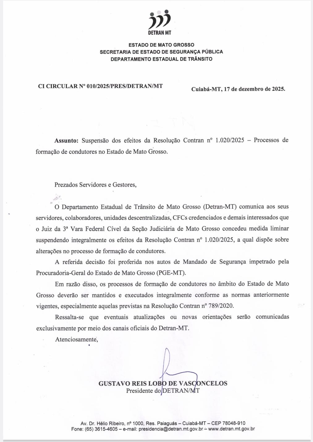 O Departamento Estadual de Trânsito de Mato Grosso (DETRAN-MT) emitiu um comunicado oficial direcionado aos servidores, colaboradores, unidades descentralizadas, Centros de Formação de Condutores (CFCs) credenciados e demais interessados, informando que a Lei nº 1.020/2025 determinou a suspensão integral dos efeitos da resolução vigente relacionada ao tema.